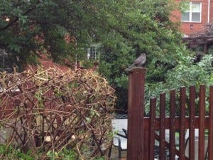 The bird sitting on the gate is a catbird. He used to care for a nest with babies. Now, he keeps fluttering around the patio and landing in that same spot to look over where the nest used to be. Whether my roommate had let the workers know the nest was there or not, they should have seen it and been more careful.