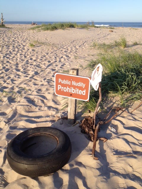 On the trail out to the beach, I searched the tops of the tall, dead trees for the large bald eagle I spotted two days before. No sign of him this time. But someone got a little cheeky on the beach. Luckily, I saw no sign of what potentially "lay" ahead (see photo below).